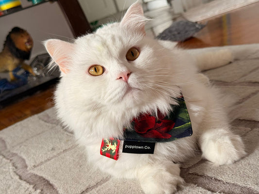 “Pupptown has the best quality I’ve ever seen on a pet bandana. the safety snap buttons make it entirely so easy to put it on a pet or take it off. my cat adores their bandanas and its the only piece of clothing she'll ever wear. and of course, cant forget the catnip pillows/eggs. 😸😸🤍🤍“