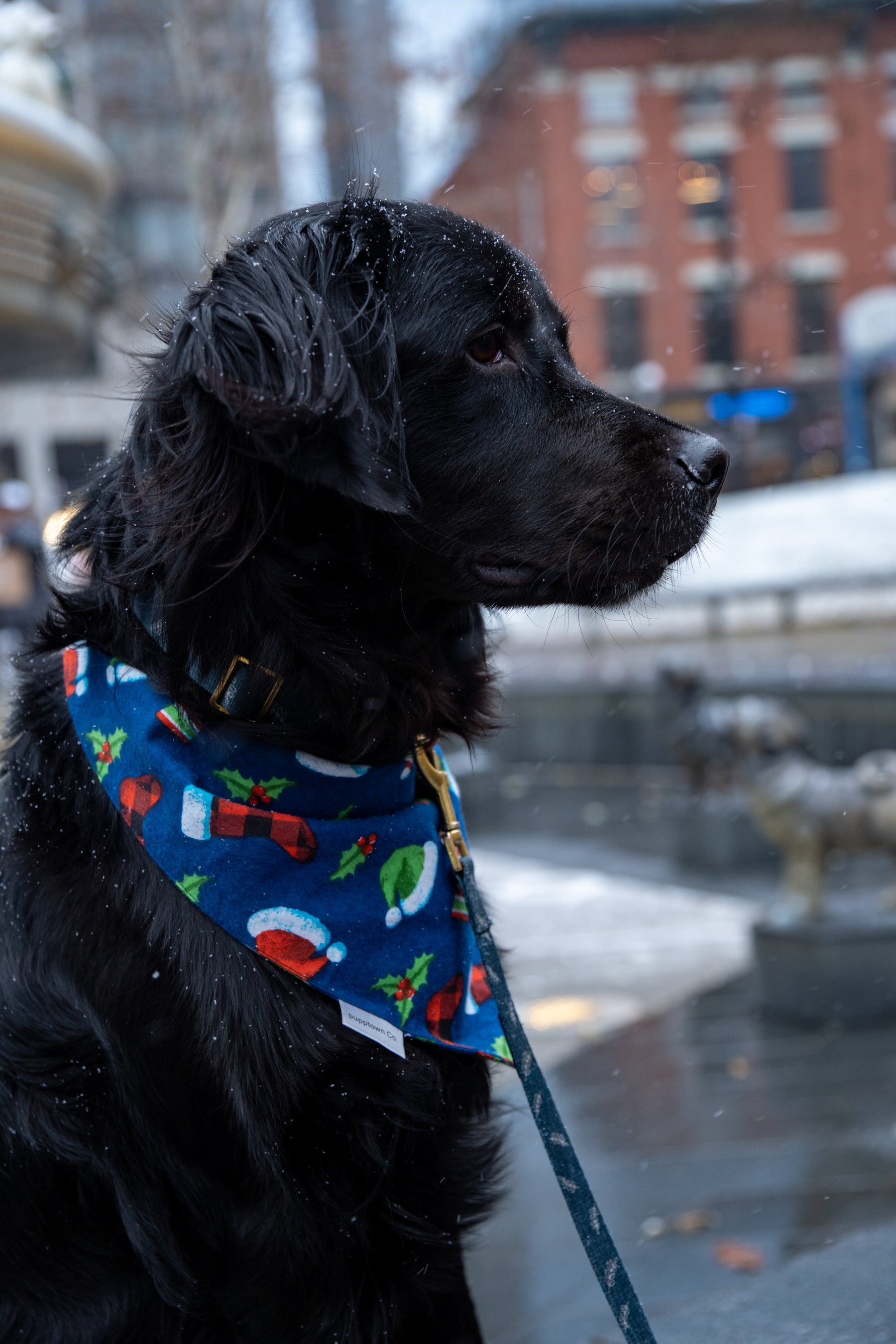 Make your pet the star of every holiday photo with our “Merry Mistletoe” Christmas Bandana — a joyful blend of festive colors and cozy charm. Featuring a deep winter-blue base with playful holiday prints like Santa hats, stockings, and mistletoe, it’s the perfect pop of cheer for your pet’s holiday wardrobe.
